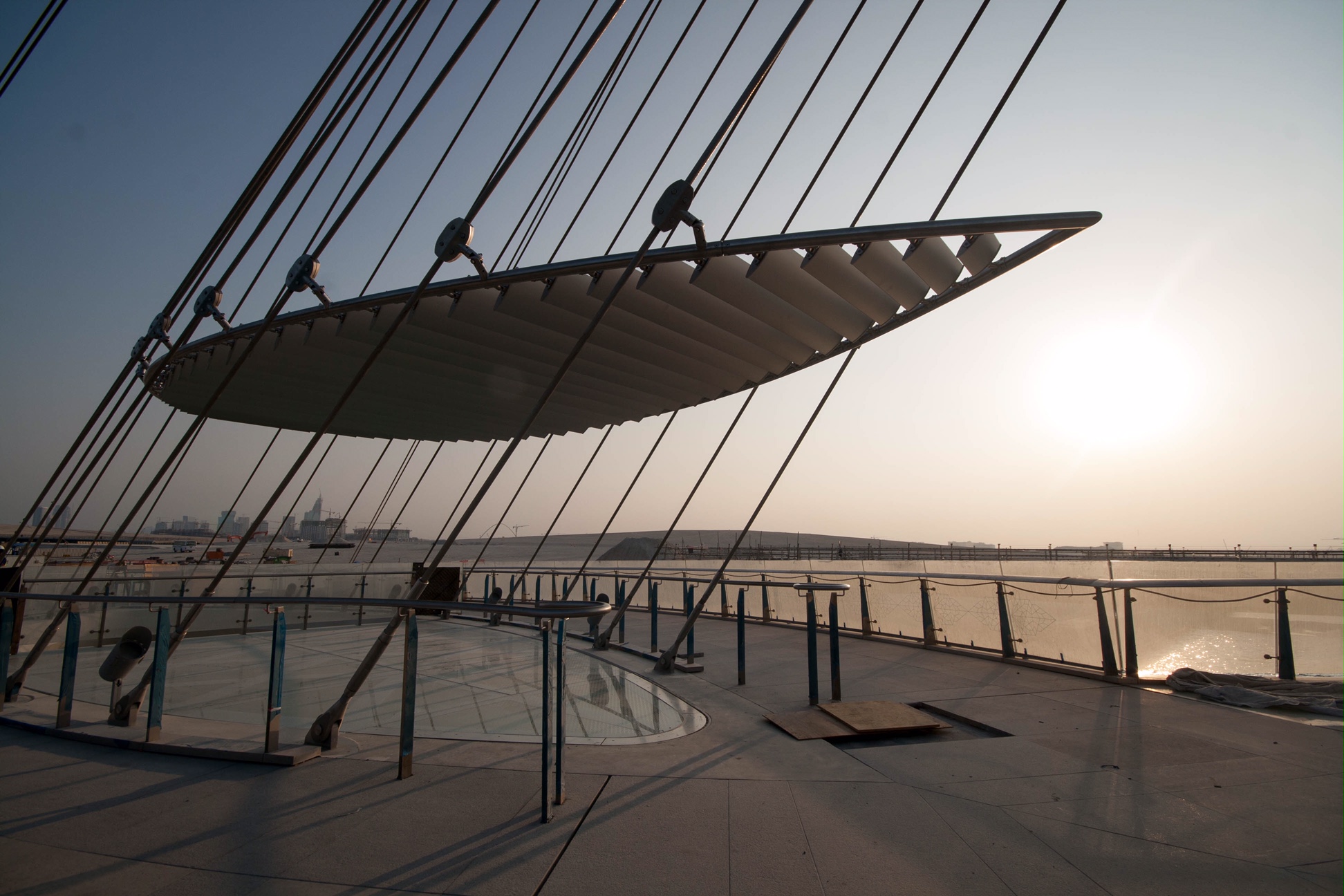 The canopies are incorporated into steel cables that are affixed to two concrete pylons that both support and link the twin bridges. Eight canopies in all will provide shade and shelter from the desert sun over what will be glass-bottomed rest/refreshment/cafe spaces on the bridges walking paths.