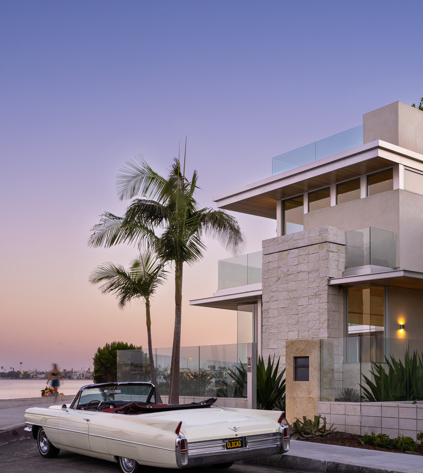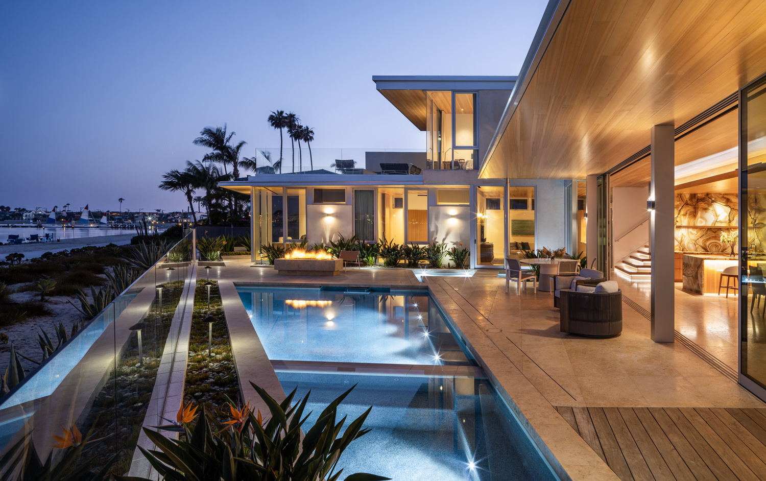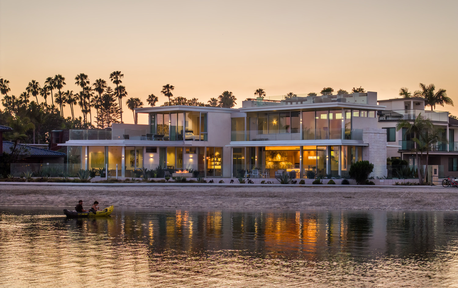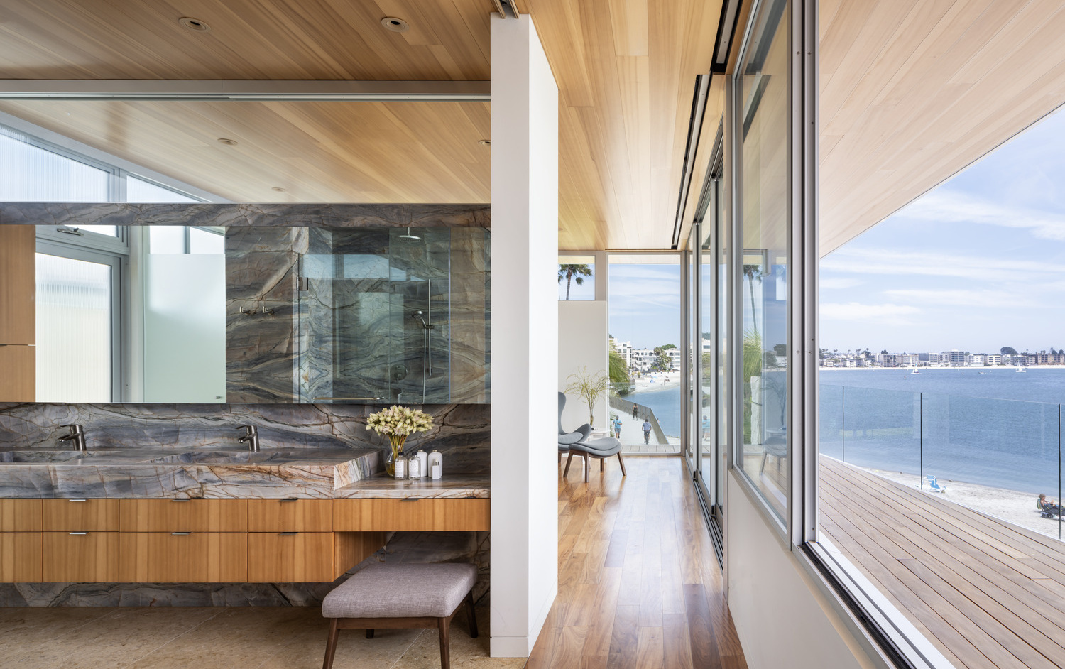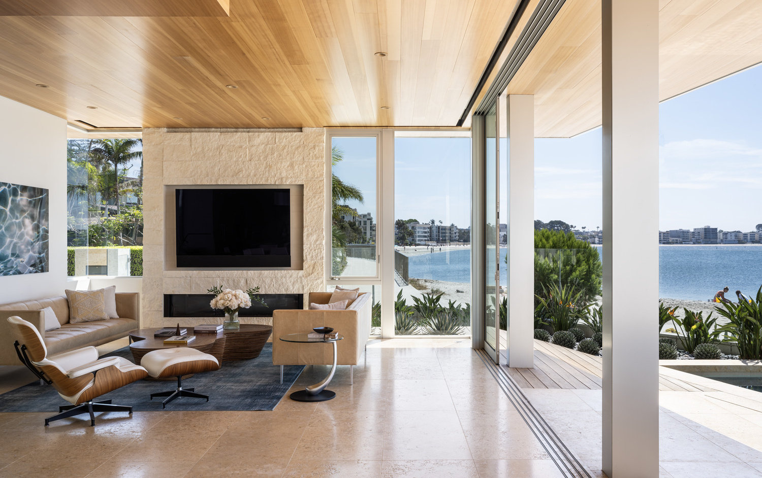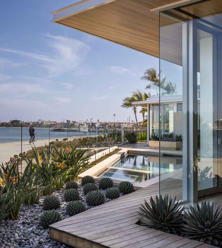Located in San Diego’s Sail Bay, this home sits prominently along the water’s edge and features an all-glass orientation towards the bay. It’s L-shaped design enhances the indoor-outdoor spaces, giving each room direct access to the exterior via floor-to-ceiling, multi-sliding glass doors that blur the lines between interior living spaces and the boardwalk.