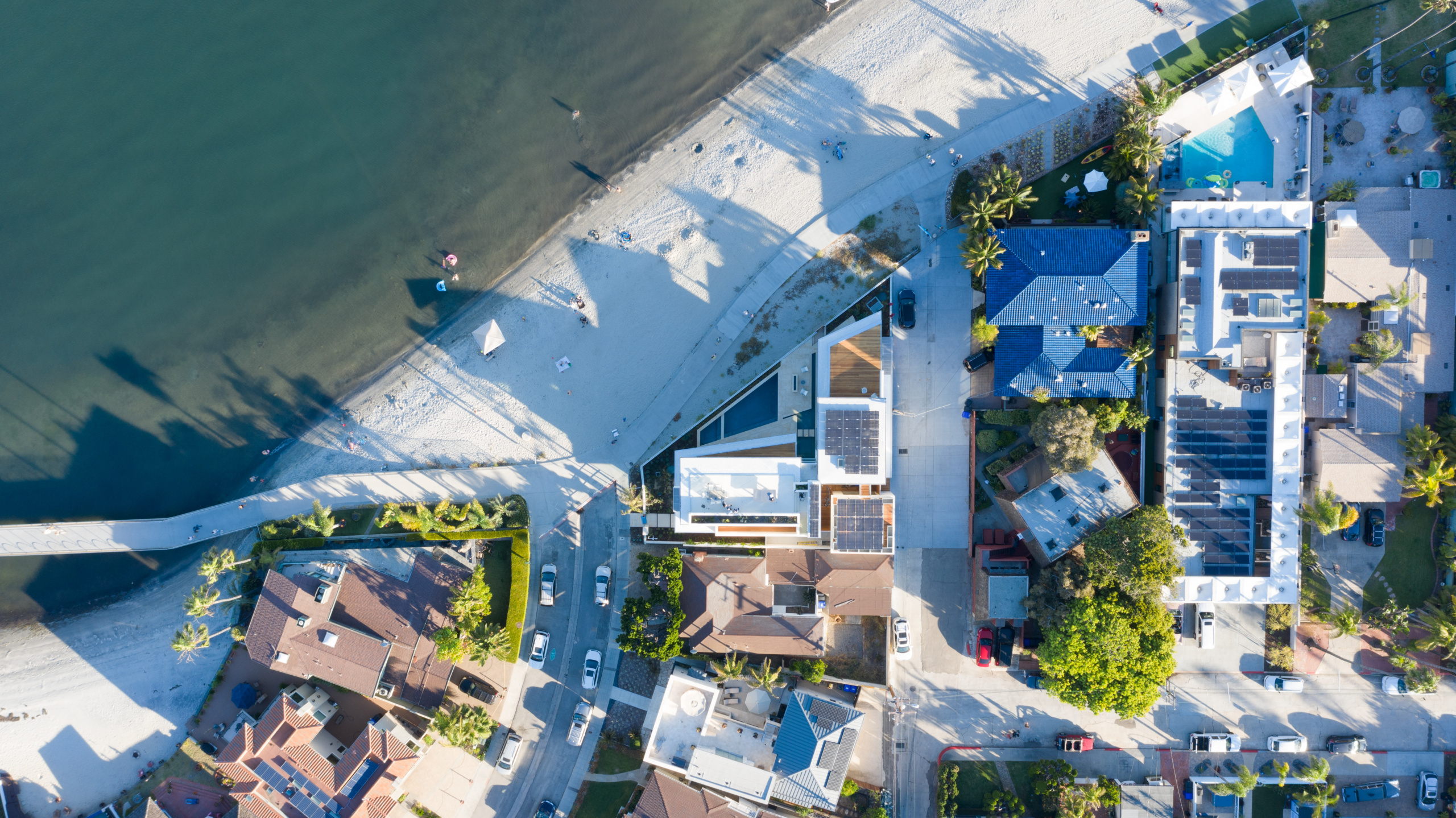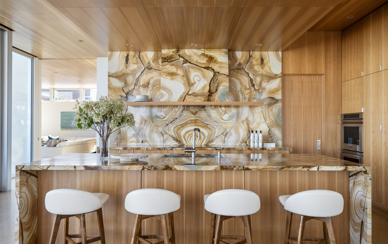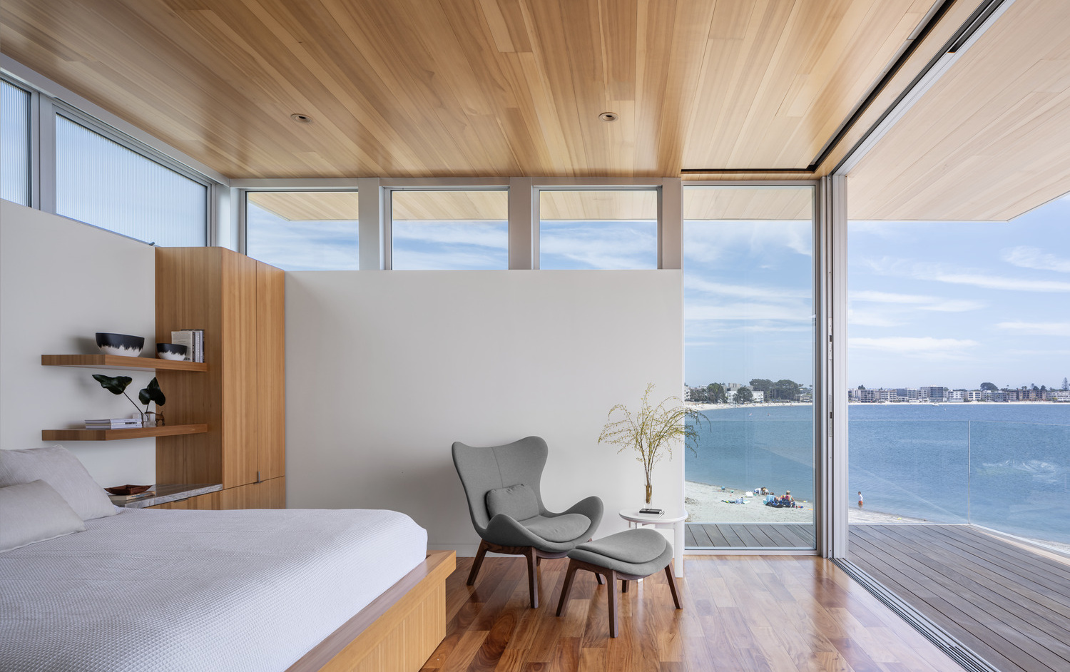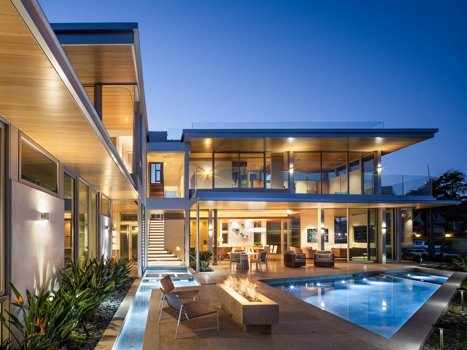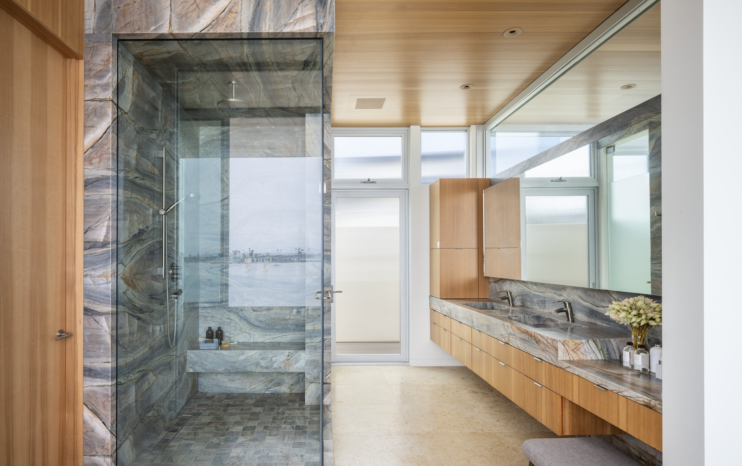 Located in San Diego’s Sail Bay, this home sits prominently along the water’s edge and features an all-glass orientation towards the bay. It’s L-shaped design enhances the indoor-outdoor spaces, giving each room direct access to the exterior via floor-to-ceiling, multi-sliding glass doors that blur the lines between interior living spaces and the boardwalk.