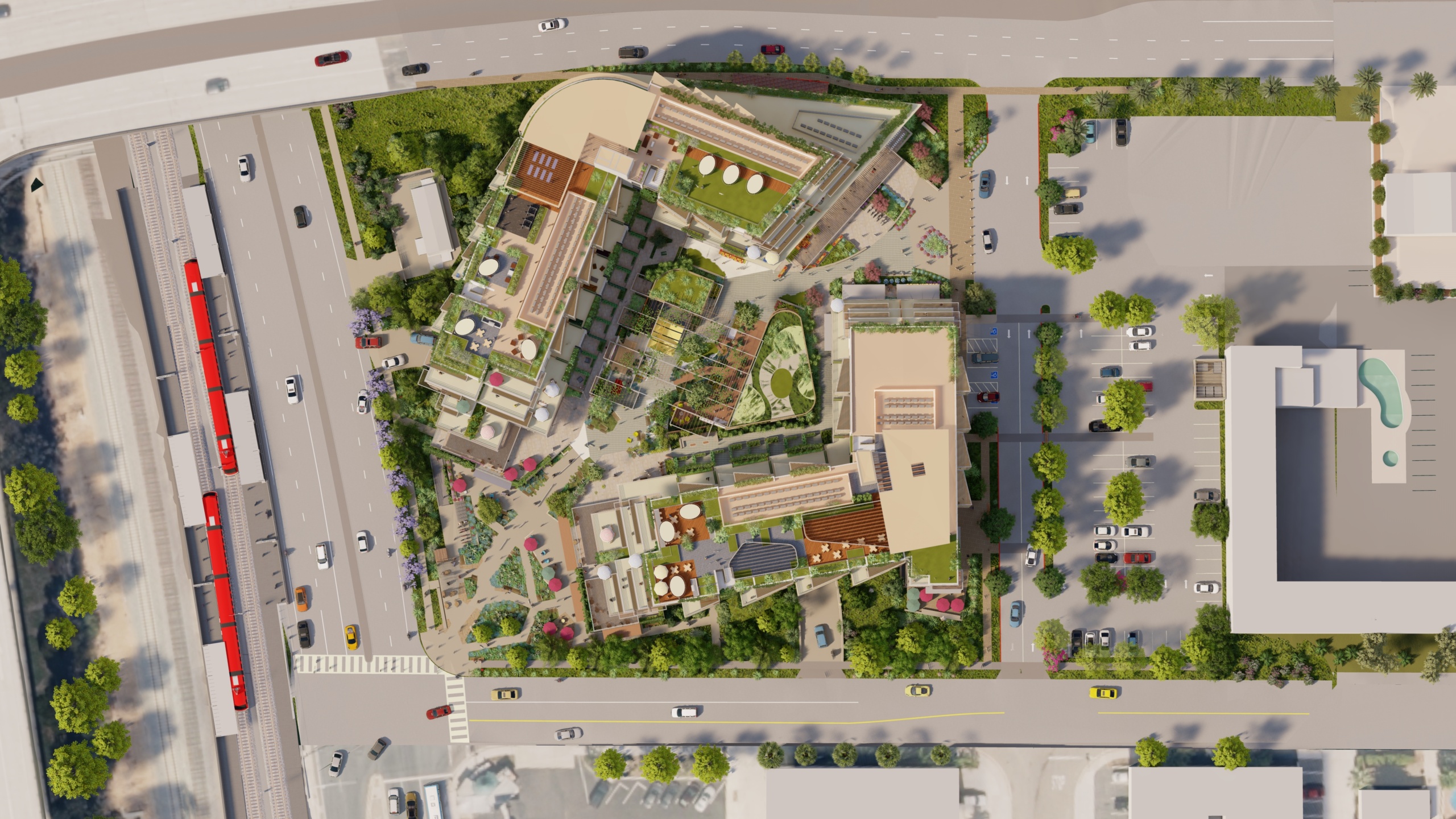 The 3.5-acre site includes two L-shaped structures that step towards the view and frame a central amenity courtyard. The mixed-use residential and retail complex will serve as a front porch to the Blue Line Trolley and stands as a representation for future live-work-play developments along the trolley corridor.