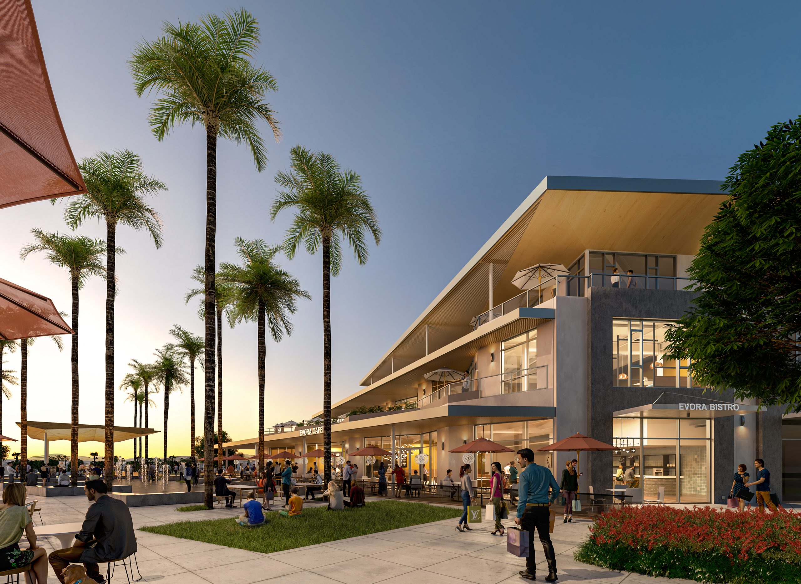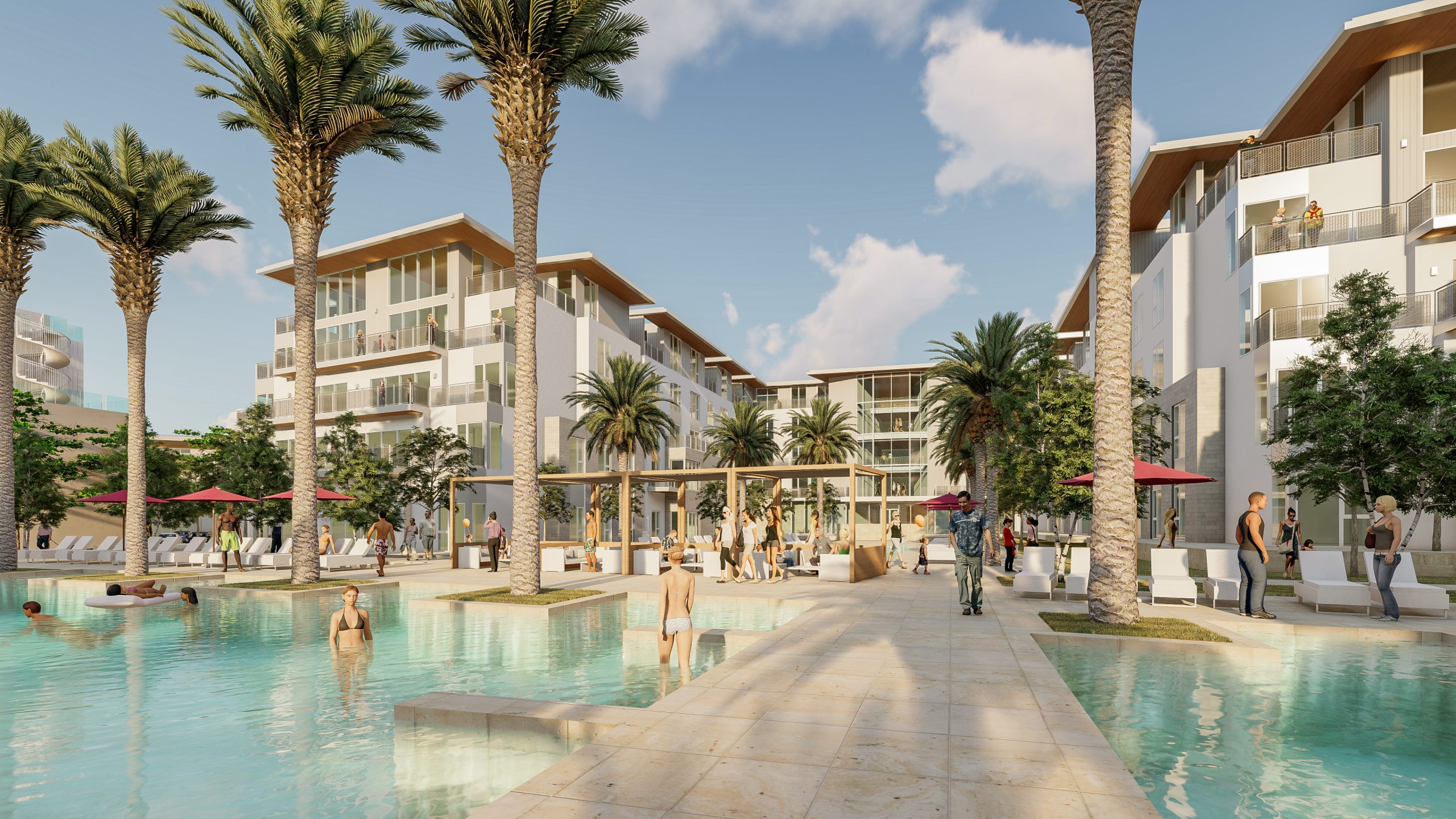 The project’s axial organization maximizes views of the Las Vegas Strip and surrounding mountains while providing a series of central outdoor amenity spaces. The commercial buildings flank a public plaza at the prominent north/east corner of the site that is activated by restaurants and an outdoor performance venue. Large gardens with pools and amenity spaces continue along the diagonal axis through the housing, providing abundant outdoor gathering areas to create a sense of community and encourage interaction.