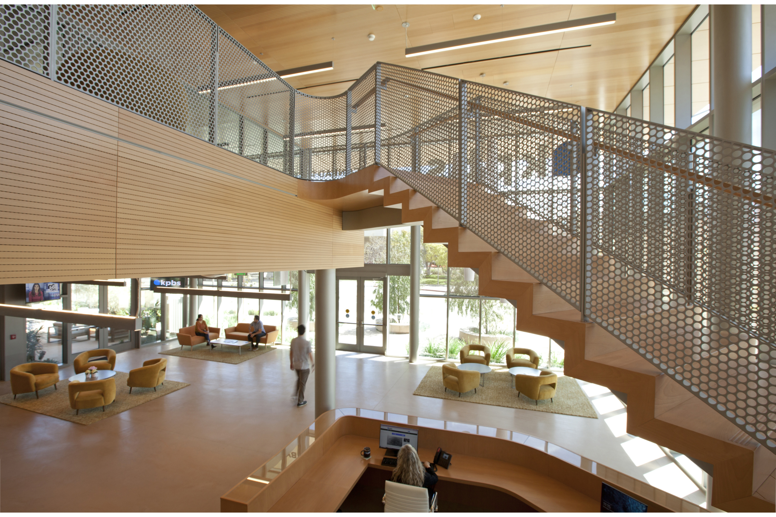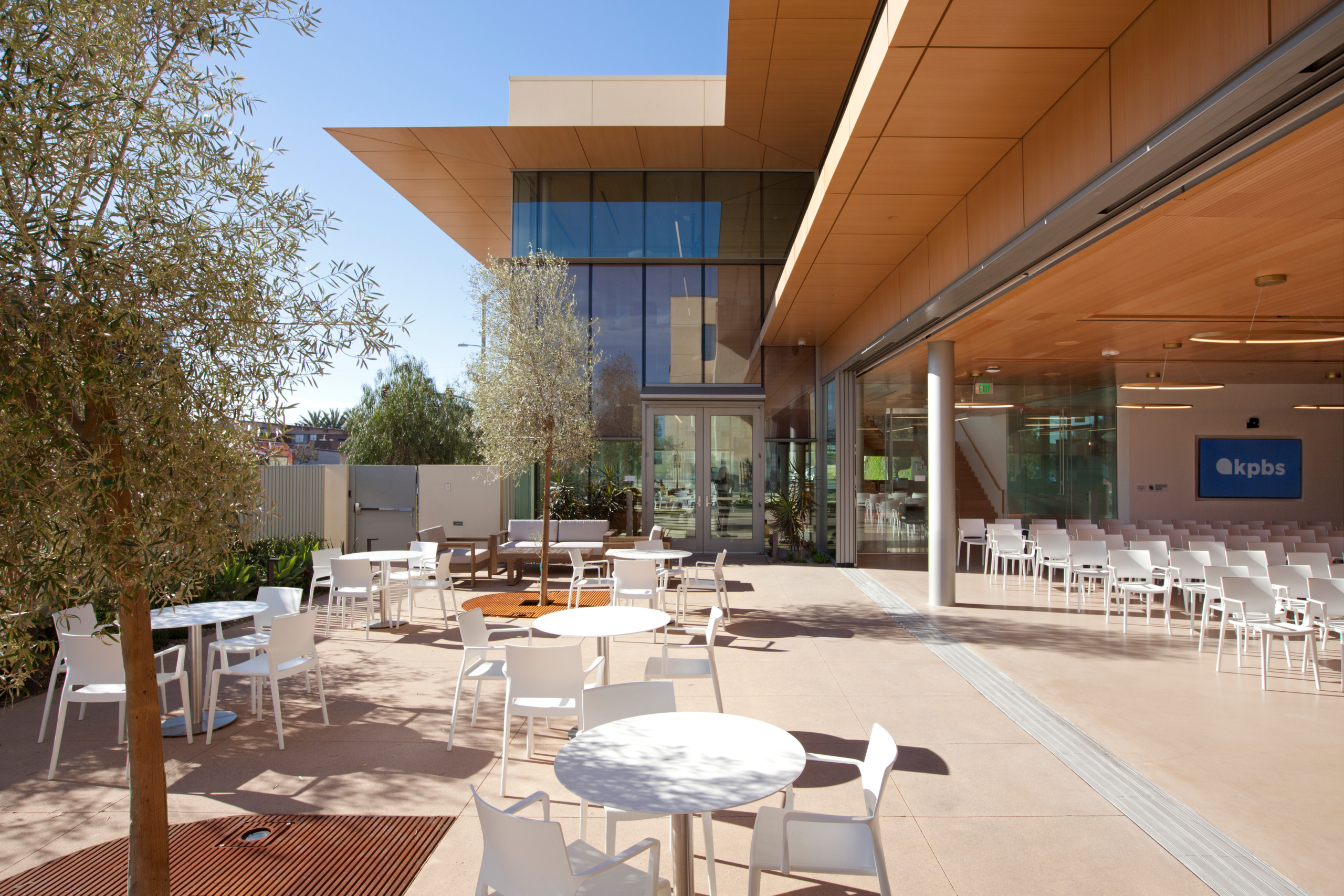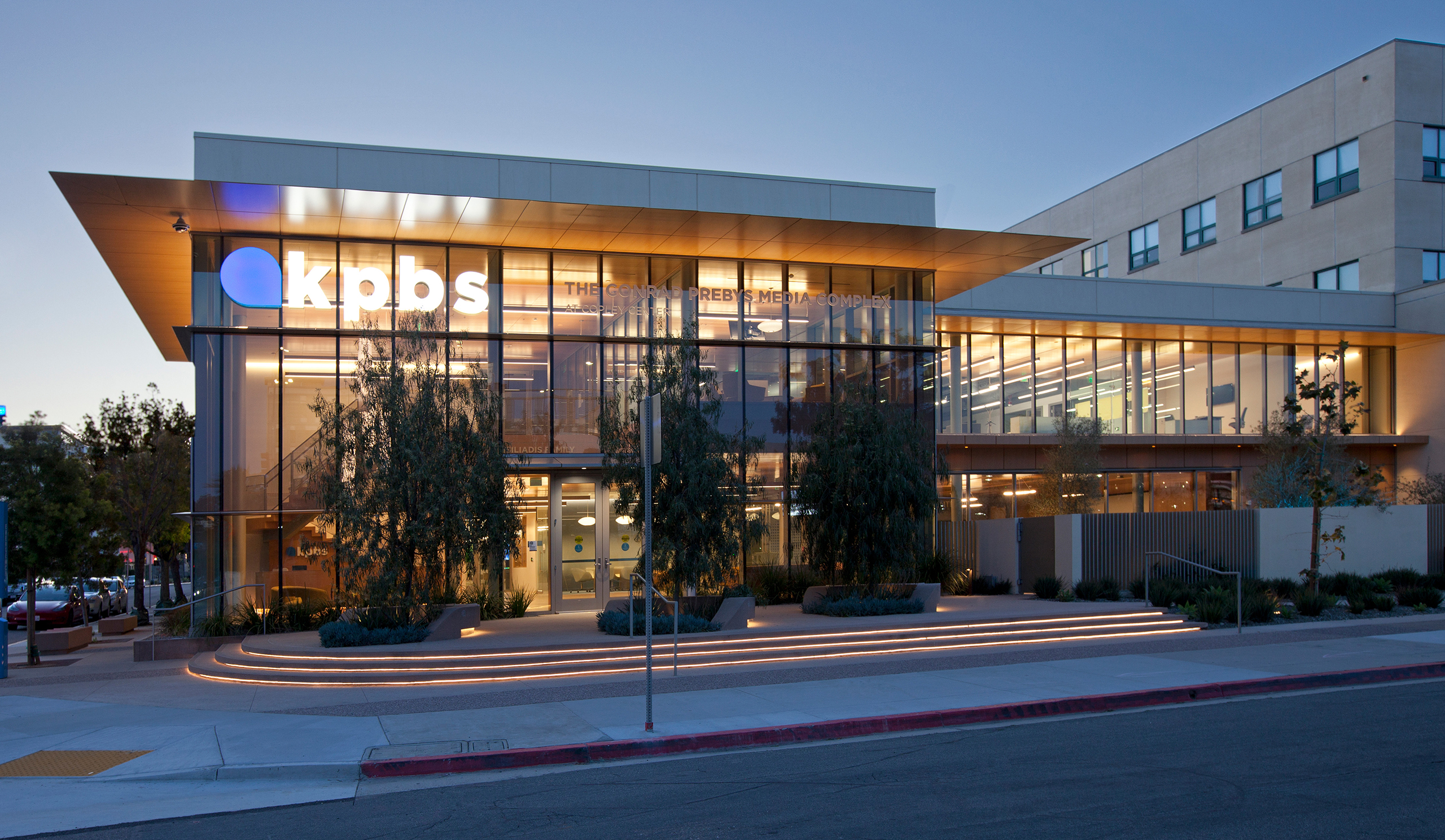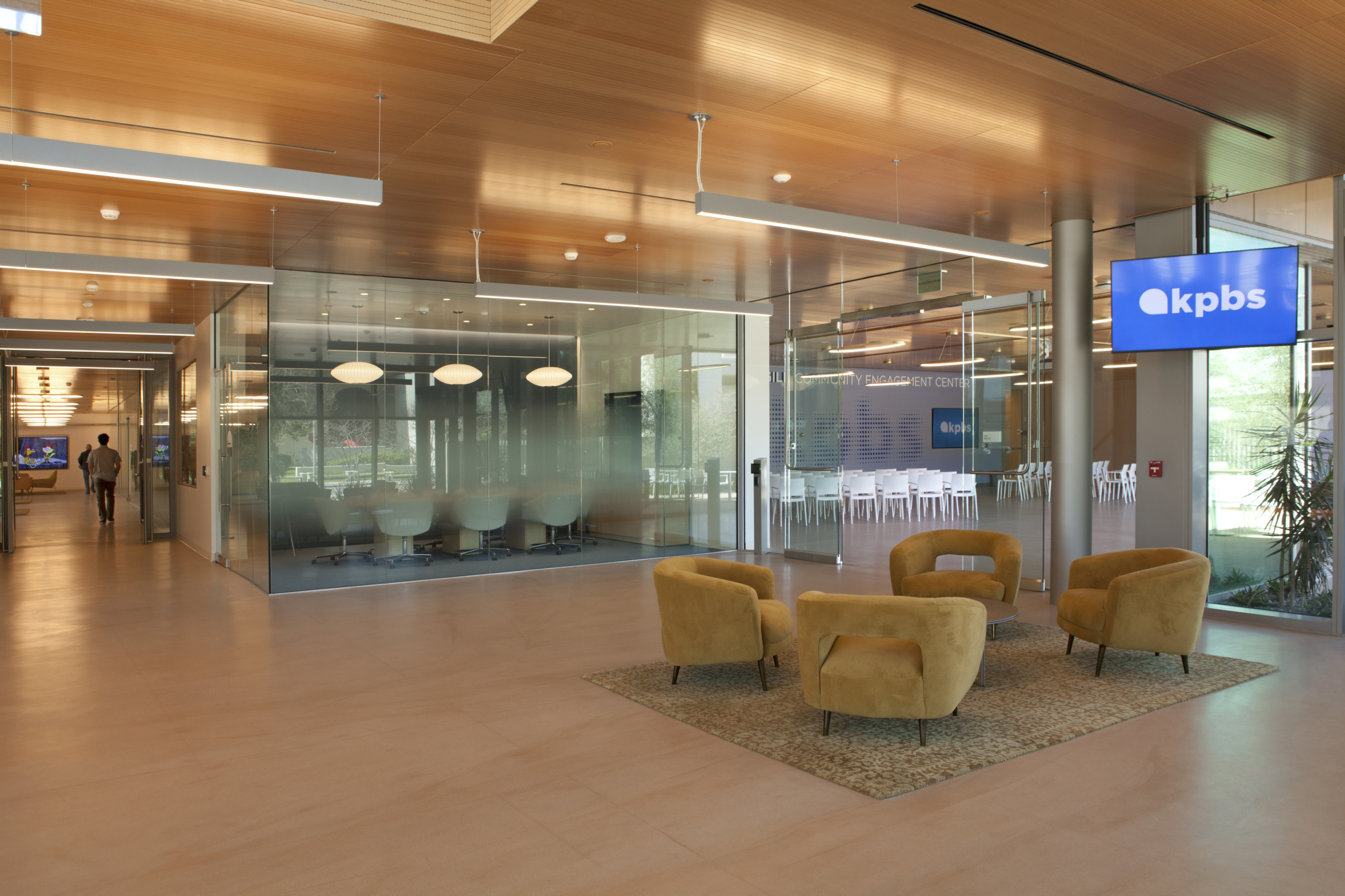 The KPBS building has been designed to maximize energy performance without sacrificing access to daylighting and views, creating a heathier work environment for its occupants. Large roof overhangs, deep eyebrows and high-performance glazing provide solar protection throughout the design. At the double height lobby areas, an encapsulated metal mesh within the insulated glazing was used to reduce heat gain and control glare.
