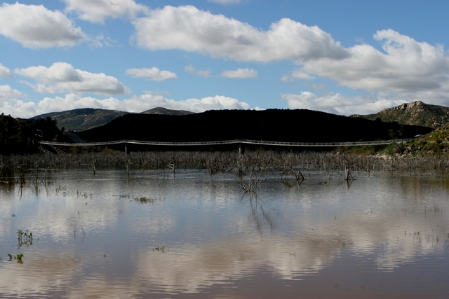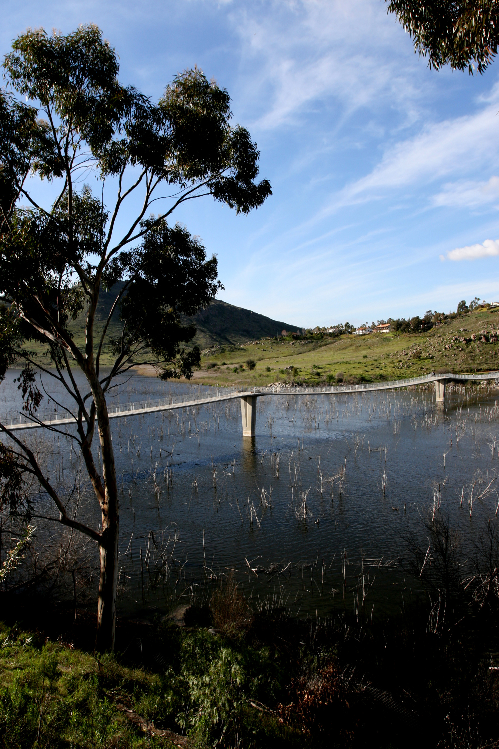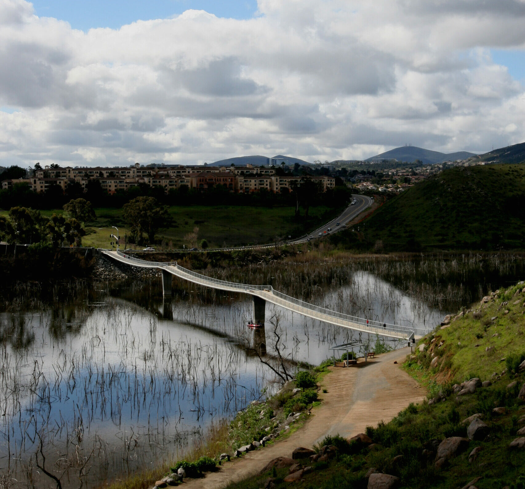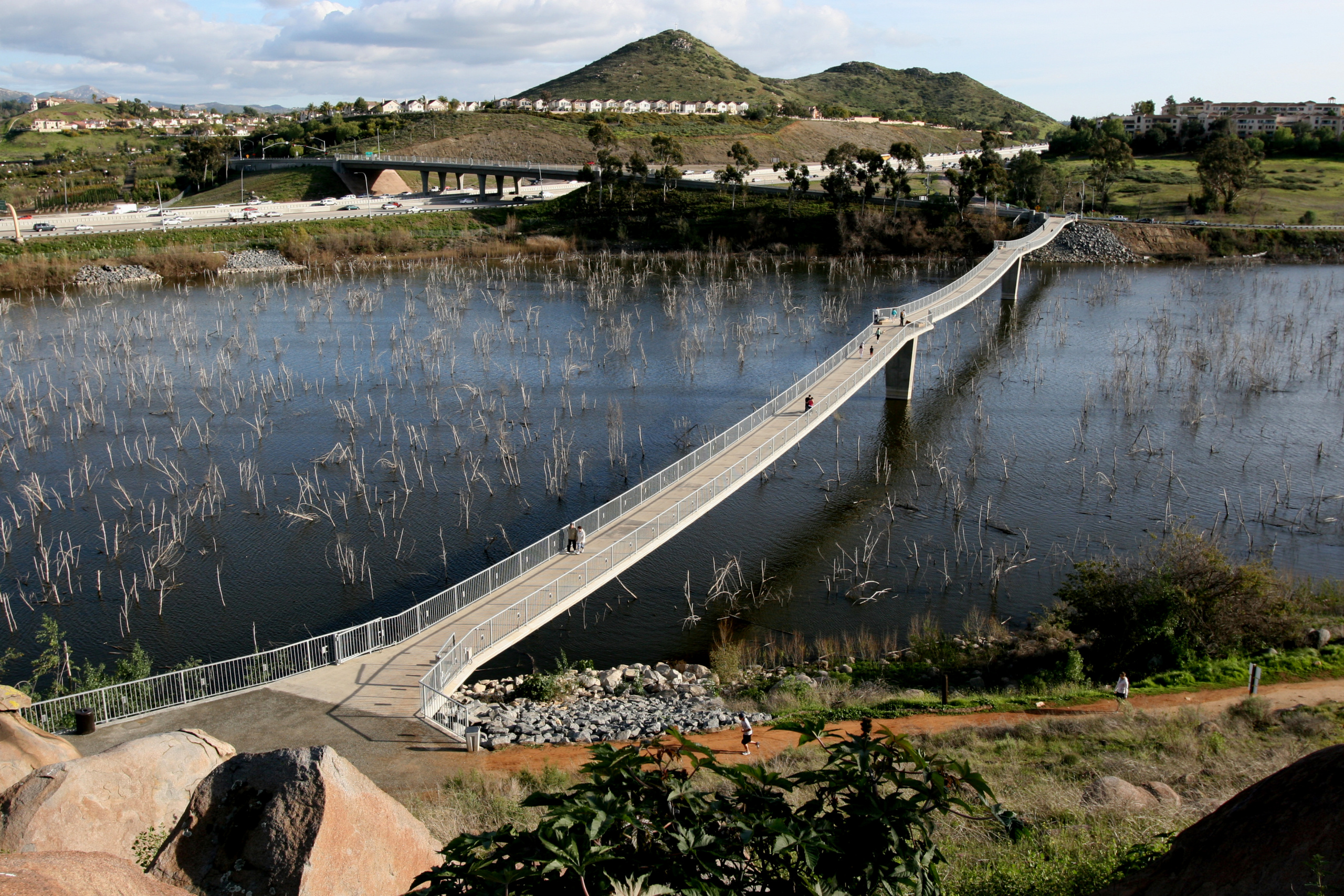 This is the world’s longest stress ribbon bridge, a suspension bridge with bearing cables embedded within the concrete deck. Only six other examples exist in North America and fewer than 50 worldwide. The Lake Hodges Bridge is 990 feet between abutments, with three equal spans and a 16-inch-thick deck. The stress ribbon design was selected due to its thin profile and the need for only two concrete piers. The design also provides a highly dramatic and graceful bridge. During rainy seasons the bridge appears to float on the lake, while during periods of drought, it is nestled within the landscape. Commissioned by the San Dieguito River Park Joint Powers Authority, the bridge connects two separate portions of an existing trail system that crosses a protected habitat.