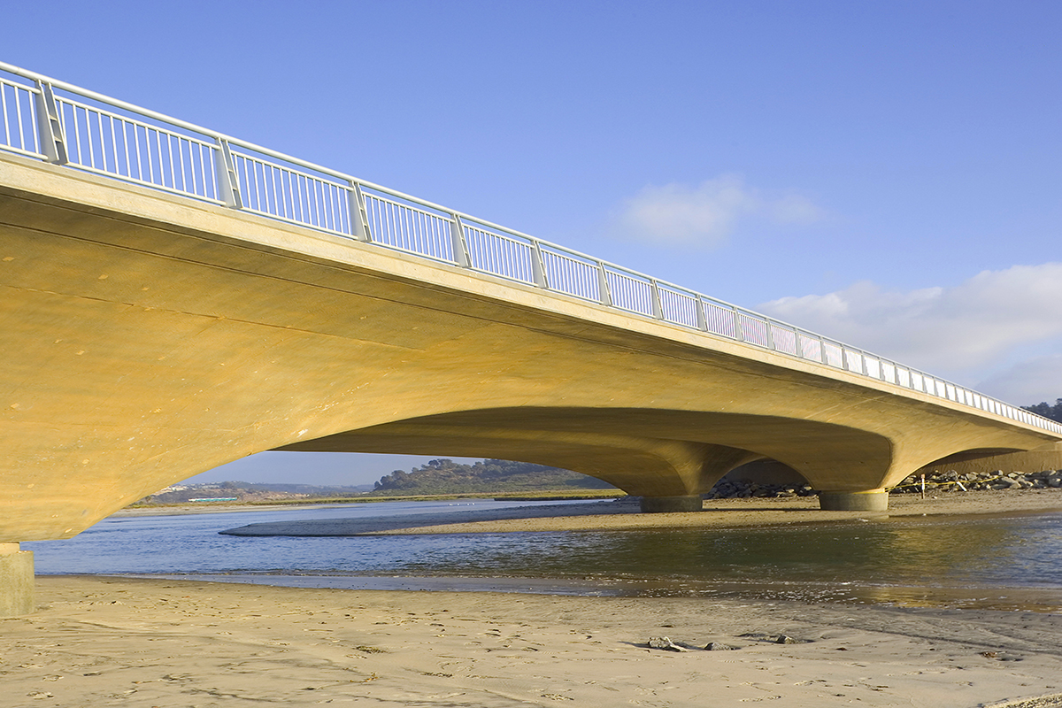 The North Torrey Pines Road Bridge replaces a 1930s-era structure deemed to be structurally and seismically inadequate, and environmentally harmful due to poor tidal flushing. The new design; a hunched, 3-span, cast-in-place, pre-stressed box girder with only 4 columns, allows for natural tidal flushing and incorporates elements from the surrounding sandstone formations. Other improvements include ADA access ramps to the beach, a 7′ wide sidewalk, two bike lanes, two bus turnouts and new storm water controls to prevent car pollutants from entering the lagoon. The graceful convex creates a Gothic arch shape that serves as a gateway to the public beach while subtly referencing an adjacent bridge over the railway to the north.