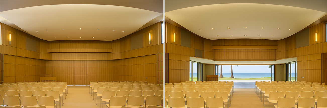 With Scripps Institute of Oceanography’s global approach to oceanographic research and its impact on the environment, the Seaside Forum serves as an important physical location for leading researchers from around the world to gather in. Located on the beach with strong winds, western sun, and an existing grove of palms, the Forum’s design responds to its unique and dramatic location while shielding guests from the elements and framing views of the ever-changing ocean. The project includes a flexible auditorium, four meeting rooms, a student lounge, a catering kitchen, and a rooftop restaurant. The facility is divided into several small, village-like structures linked by a trellis, creating a porous design that maintains public access and views of the ocean. The auditorium is tucked into the hillside to minimize its mass from the east, allowing for gentle ramps to access roof terraces. A series of large pocketing doors between the auditorium, lobby, and oceanfront terrace allow the main space to accommodate a wide variety of functions while simultaneously maximizing ocean views.