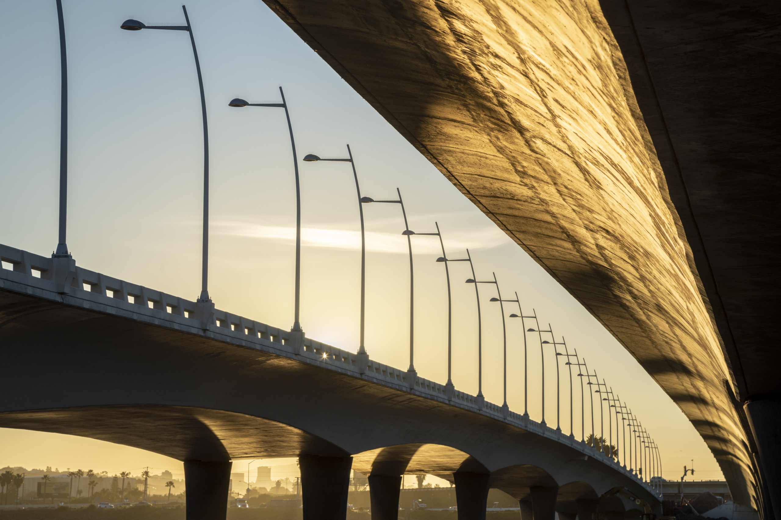 The architectural elements of the bridge drew inspiration from the Great Egret, known for its stark white color perched on dark legs. This is manifested by the main spans of the bridge floating above the waterway through the use of white stained concrete and dark columns that meet the water.
